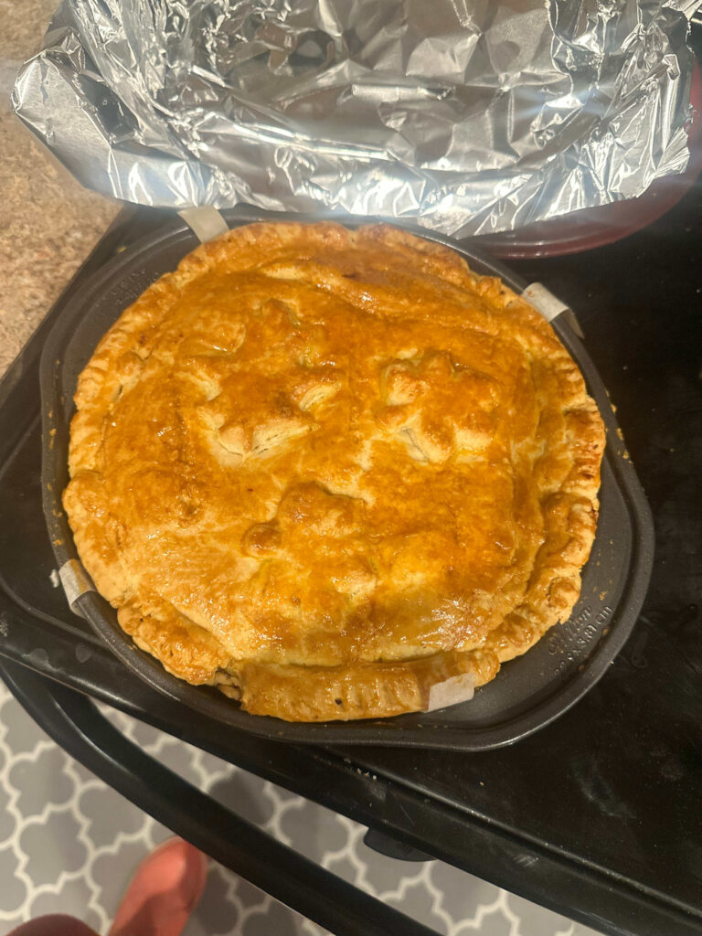5. Place the dough on top of the pie and pinch it closed around the edges using the tines of a fork, then slash the center lightly with a knife. Brush with the egg yolk, place on a baking sheet and bake for 40-45 minutes, or until the pastry is puffy and golden.